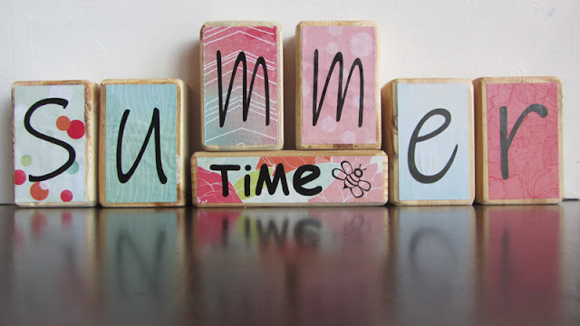 Then we used patriotic and summer colored scrapbook paper cut to fit inside the blocks. 6 patriotic colored papers and 6 summer colored papers were cut to 2 1/8th" by 3.5". One patriotic paper and one summer paper was cut to 1 3/8" by 5.5".